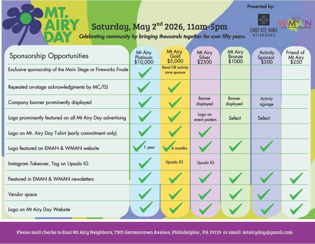 Your sponsorship plays a pivotal role in the success of Mt. Airy Day. Upon receipt of your donation, you will be contacted with additional information regarding your sponsorship. We sincerely thank you for your generous support.